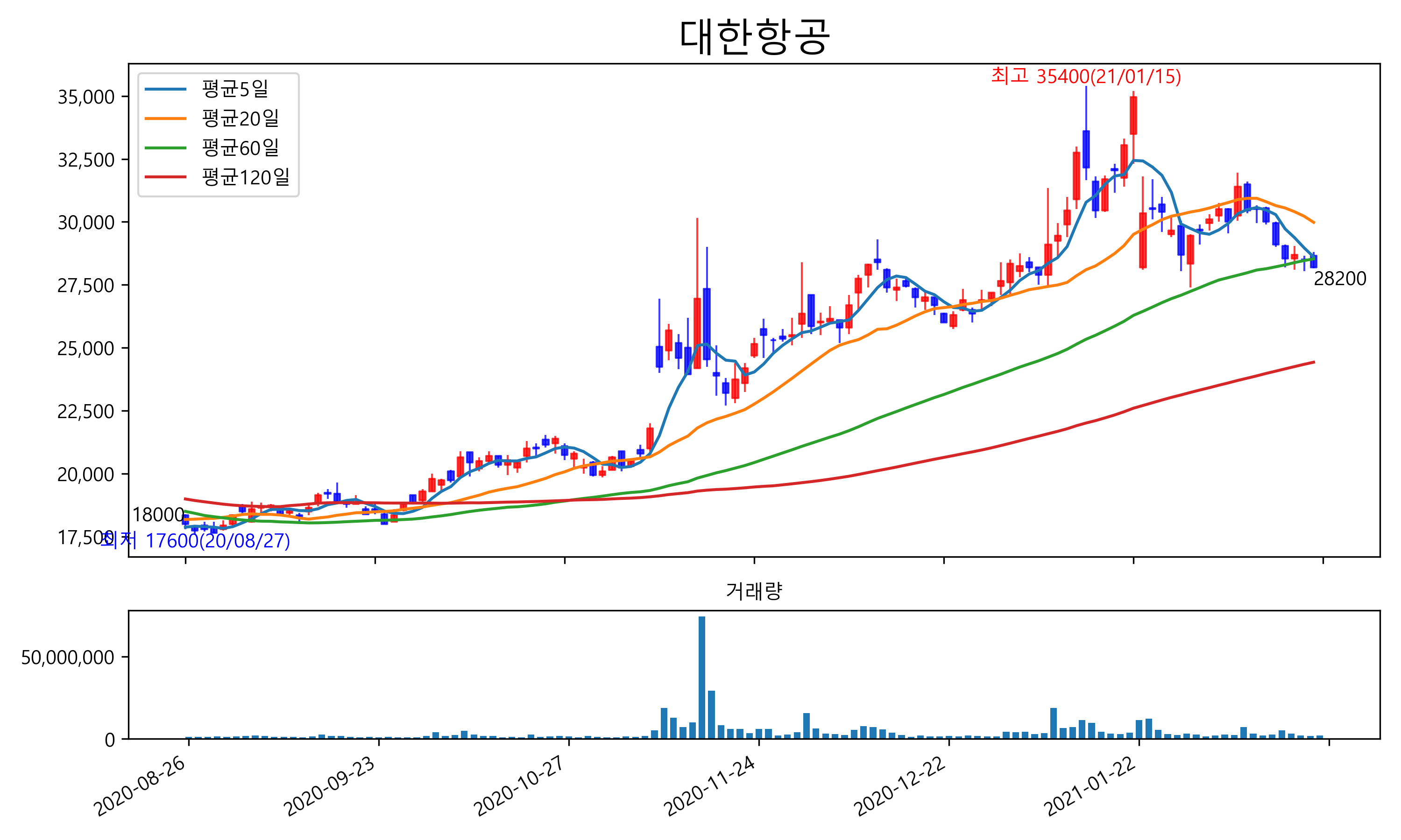 최근 6개월간 캔들차트 및 이동평균선입니다.