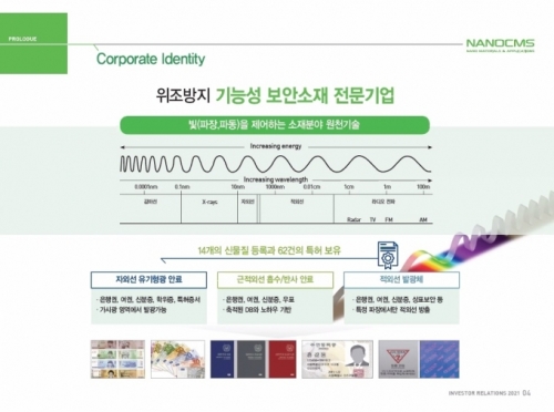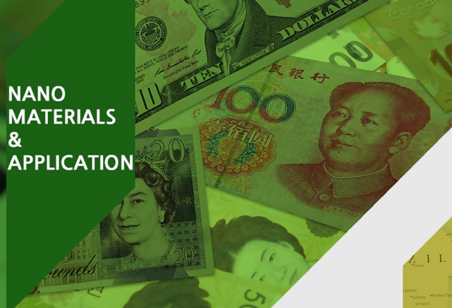 - 나노기반 화학구조 설계를 통한 파장 선택성 소재 개발 기술을 통하여 지폐, 여권, 운전면허증, 주민등록증(NID CARD) 등의 보안인쇄에 적용되는 보안잉크용 타간트(Taggant)를 개발하고 관련 사업을 영위