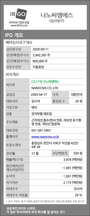 나노씨엠에스의 IPO는 2017년에 도전했지만 좌절되었습니다. 2017년 6월 한국거래소에 코스닥 상장을 위한 예비심사청구서를 제출하여 기술특례 트랙을 이용한 상장을 추진했지만 유로(EURO) 관련 매출이 증권신고서 작성 이전에 발생할 것으로 예상됐지만 이것이 지연되면서 상장을 자진 철회했습니다.