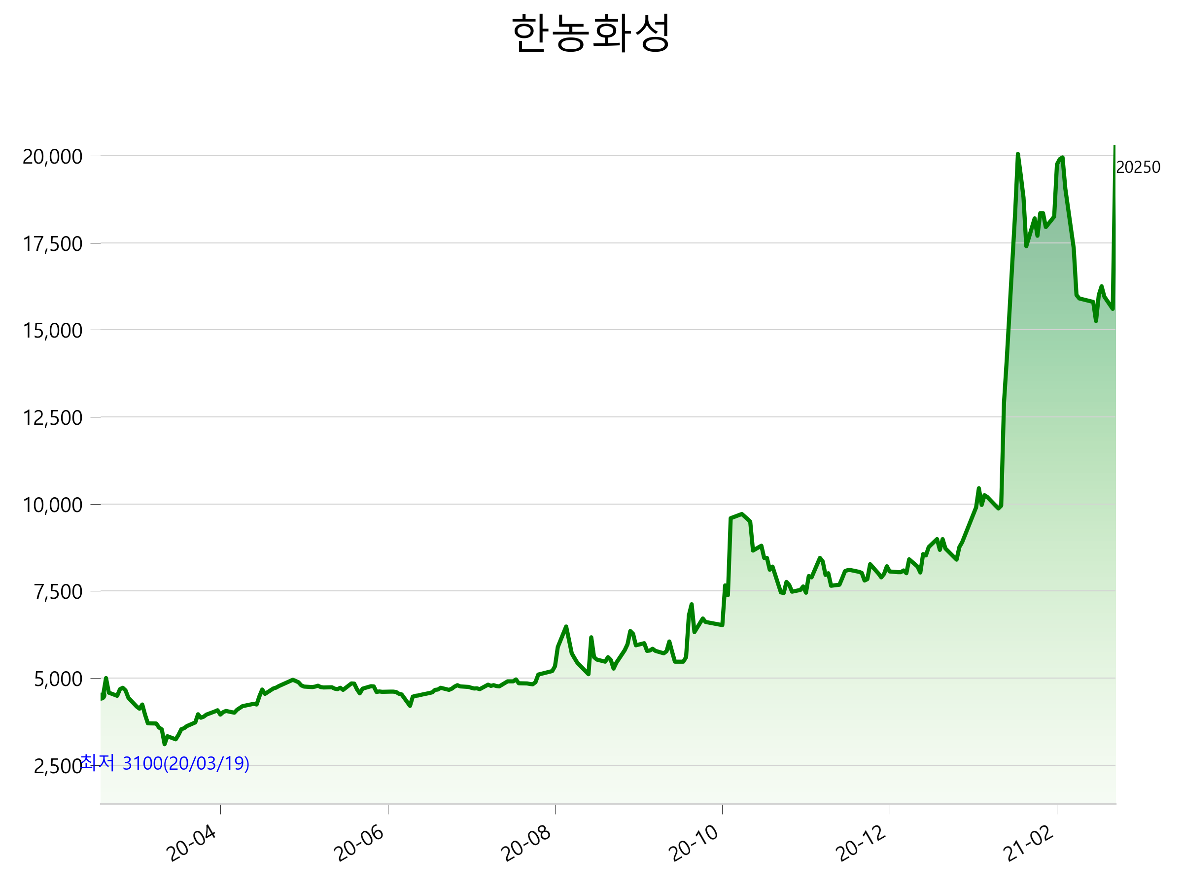 52주 최고가는 20,250원(2021-02-23), 52주 최저가는 3,100원(2020-03-19)으로 52주간 주가 상승률은 348.0% 입니다.