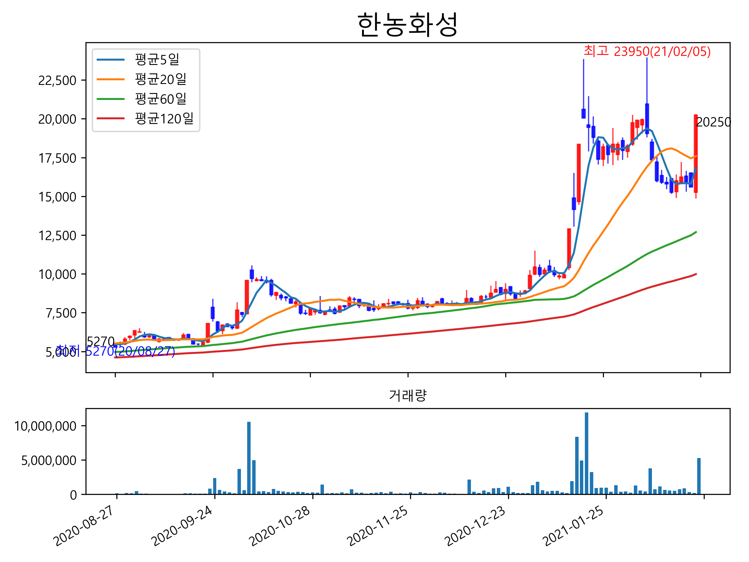 최근 6개월간 캔들차트 및 이동평균선입니다.