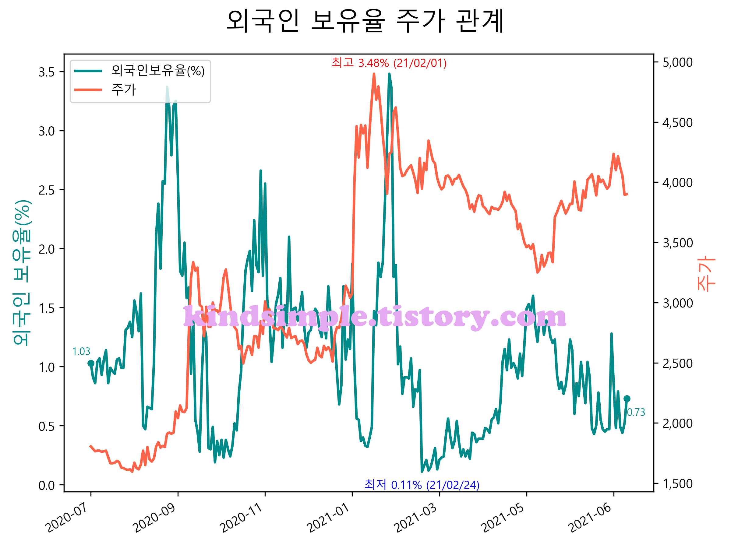 최근 1년간 외국인 보유율 및 주가와의 관계입니다.
