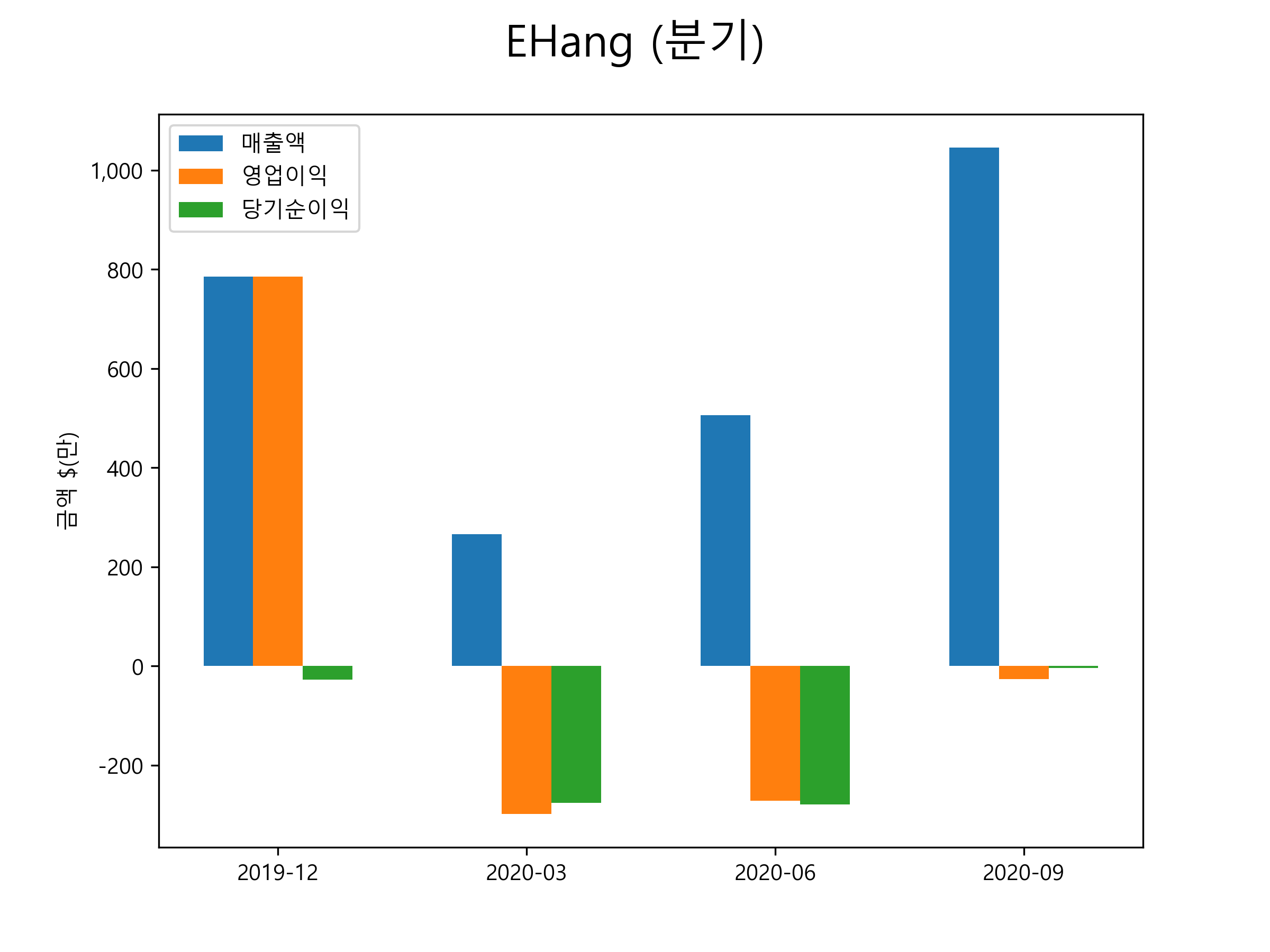EHang의 2020년 3분기 매출은 1045.4억달러, 영업손실 -26.7억달러, 당기순손실 -3.9억달러을 기록했습니다. 분기별 매출 및 영업이익, 당기순이익 표입니다.