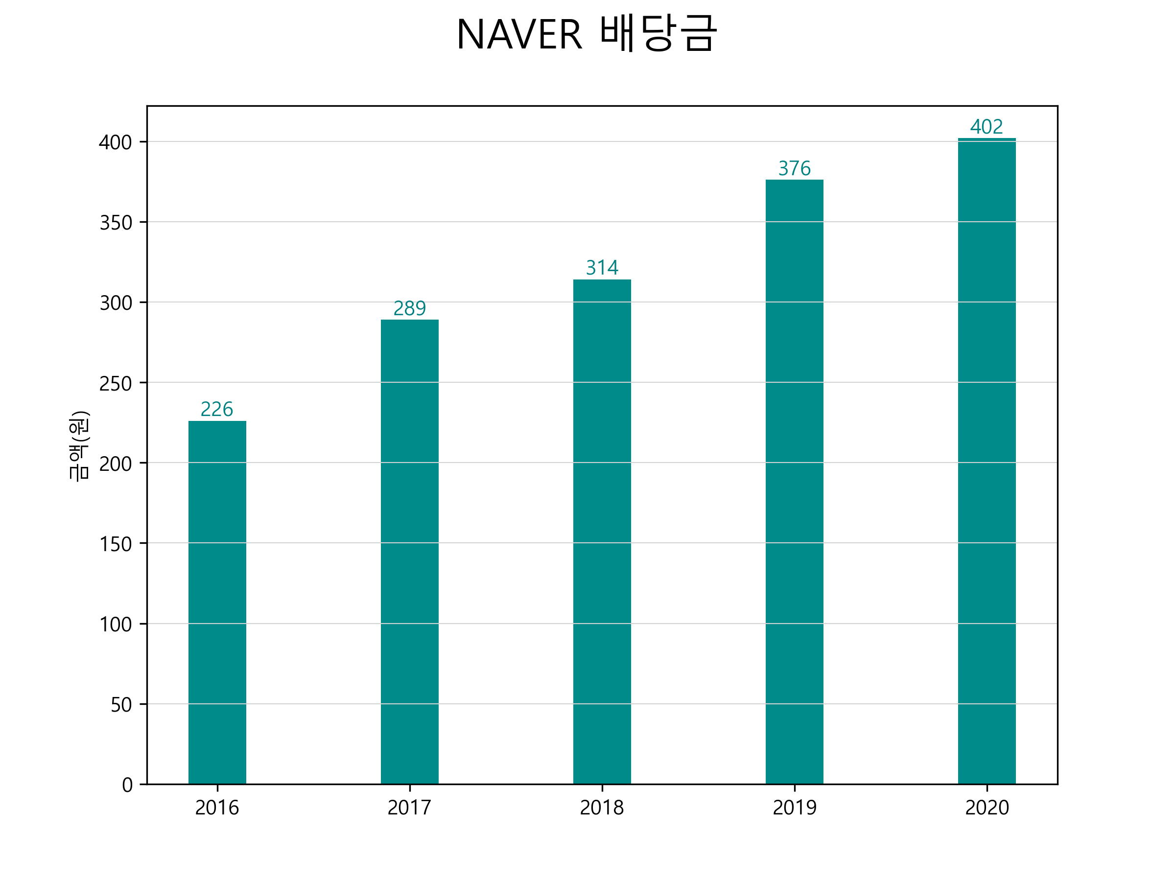 | 배당금 | 226 | 289 | 314 | 376 | 402 |