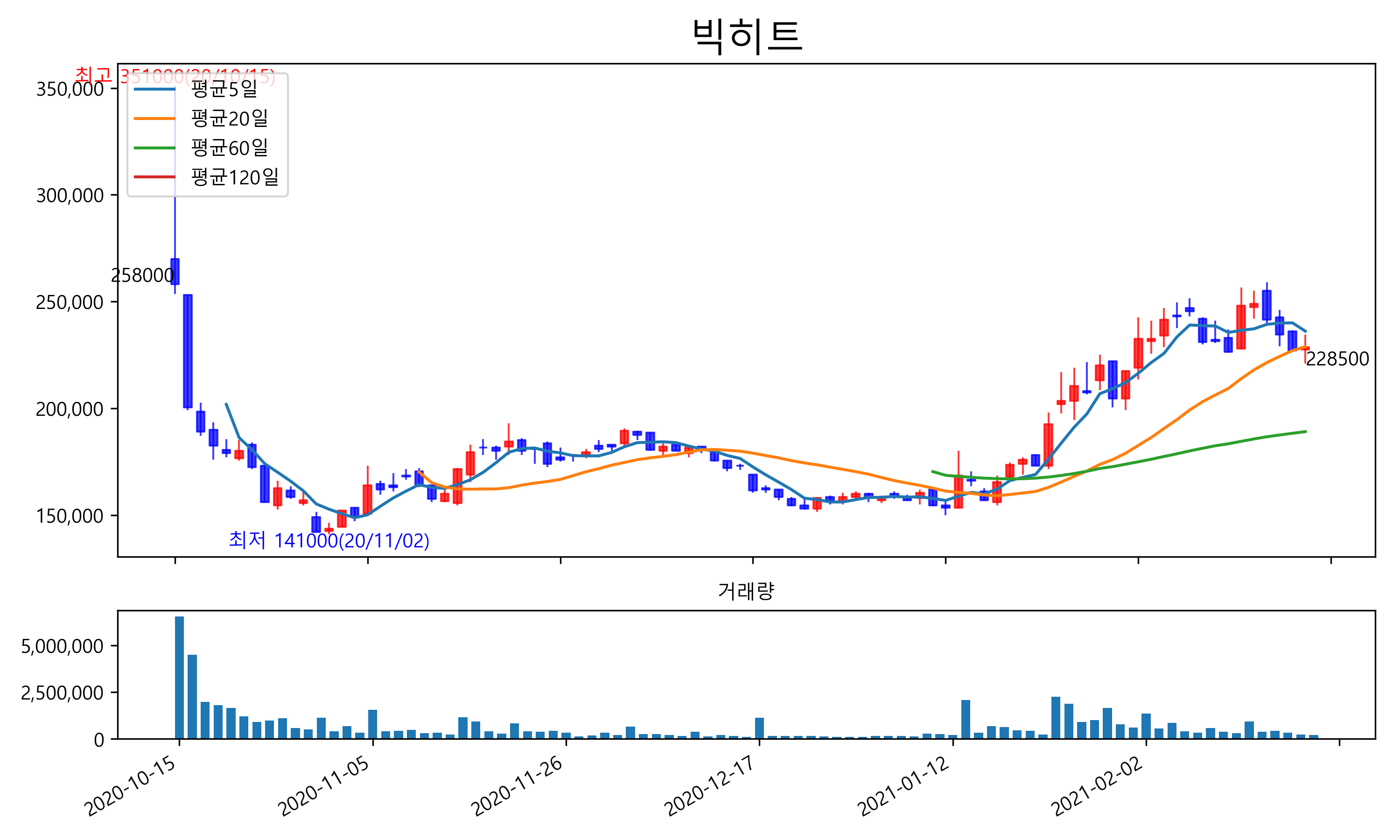 최근 6개월간 캔들차트 및 이동평균선입니다.