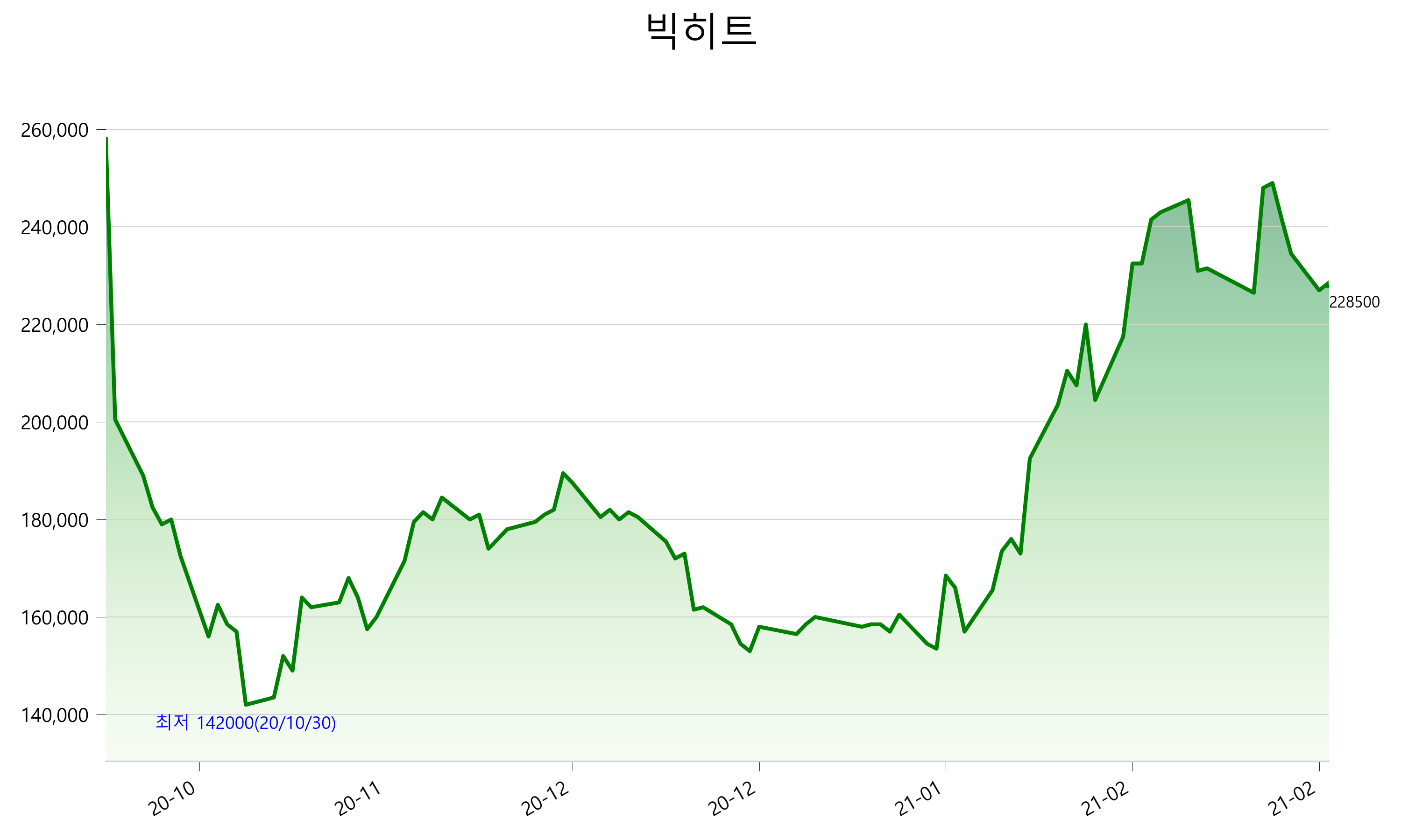 52주 최고가는 258,000원(2020-10-15), 52주 최저가는 142,000원(2020-10-30)으로 52주간 변동률은 -11.4% 입니다.