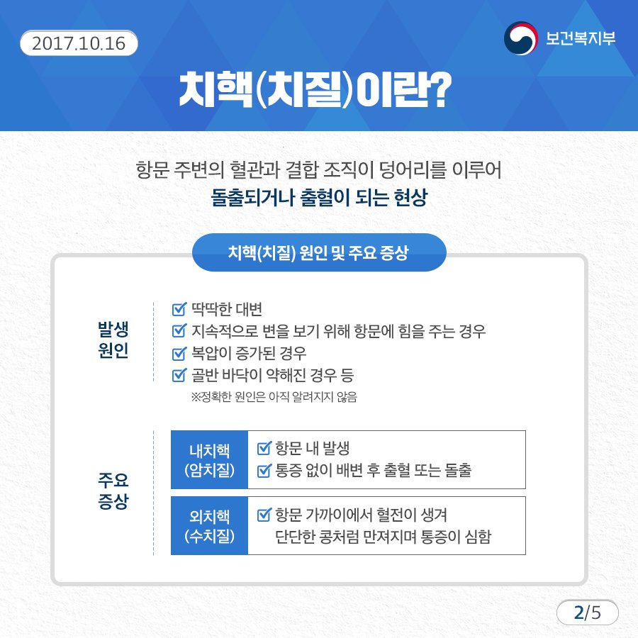 치질은 남녀 모두가 걸릴 수 있는 흔한 질병 중 하나로 병원을 찾지 않는 사람들까지 포함하면 전체 인구의 약 50% 정도가 치질로 인해 불편함을 느끼고 있는 것으로 추산됩니다. 치질은 보통 치핵(Hemorrhoids)로 불리며 항문 및 직장에 존재하는 치핵 조직이 항문 밖으로 빠져나오는 내치핵과 항문 밖의 치핵 조직이 부풀어올라 덩어리처럼 만져지는 외치핵을 포함합니다.