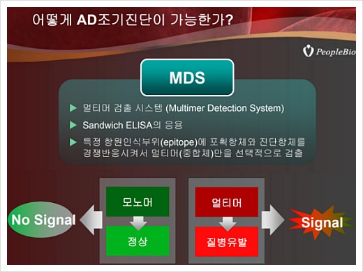 혈액 기반 알츠하이머병 조기진단 키트 ‘MDS-OaβTest’는 알츠하이머병 의심 환자의 혈장에 존재하는 혈액 내 베타-아밀로이드의 올리고머화 정도를 측정해 발병 위험도를 측정하는 제품으로, 2022년 국내 120만~150만 건 테스트를 목표하고 있습니다.