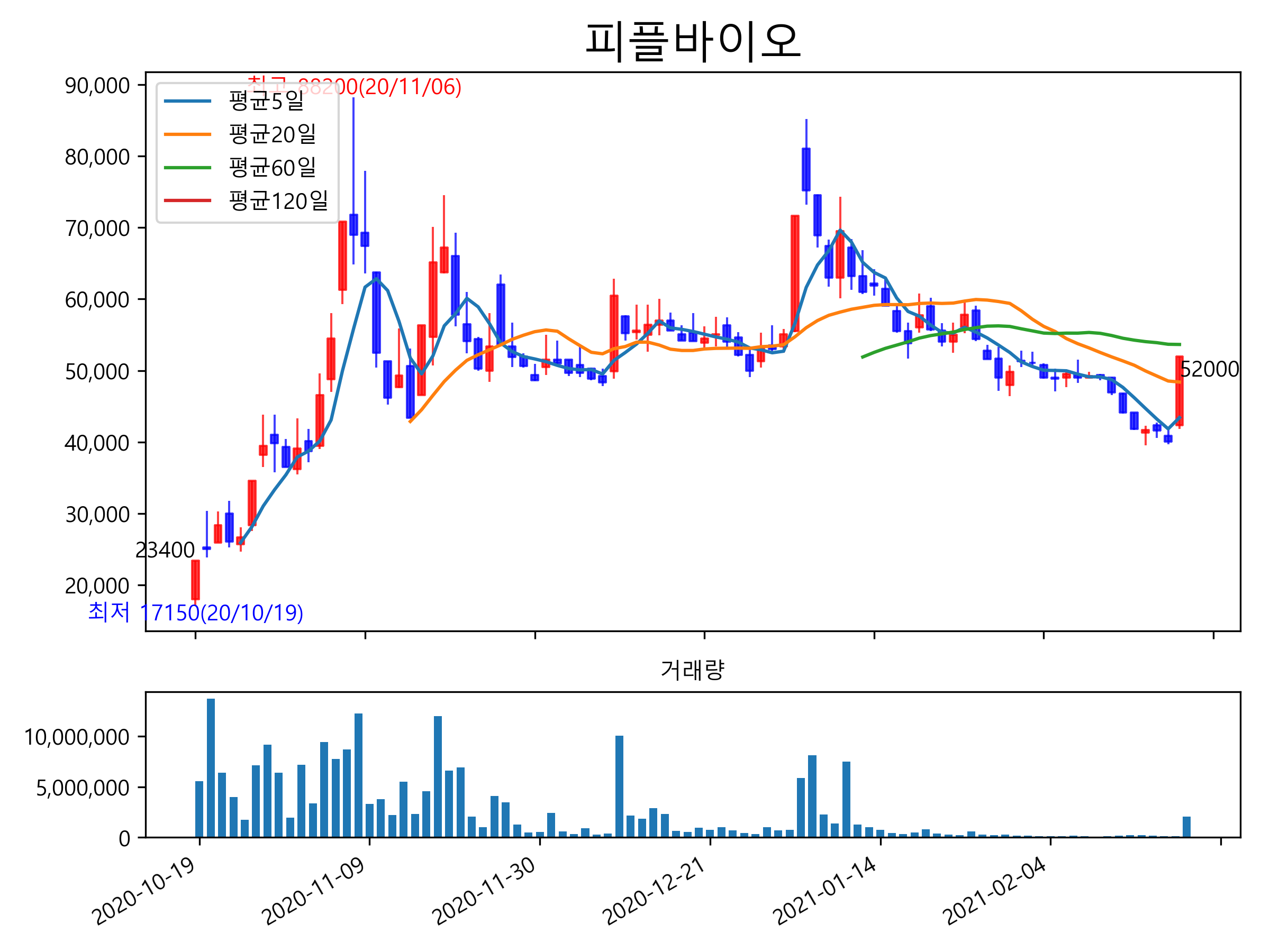 최근 6개월간 캔들차트 및 이동평균선입니다.