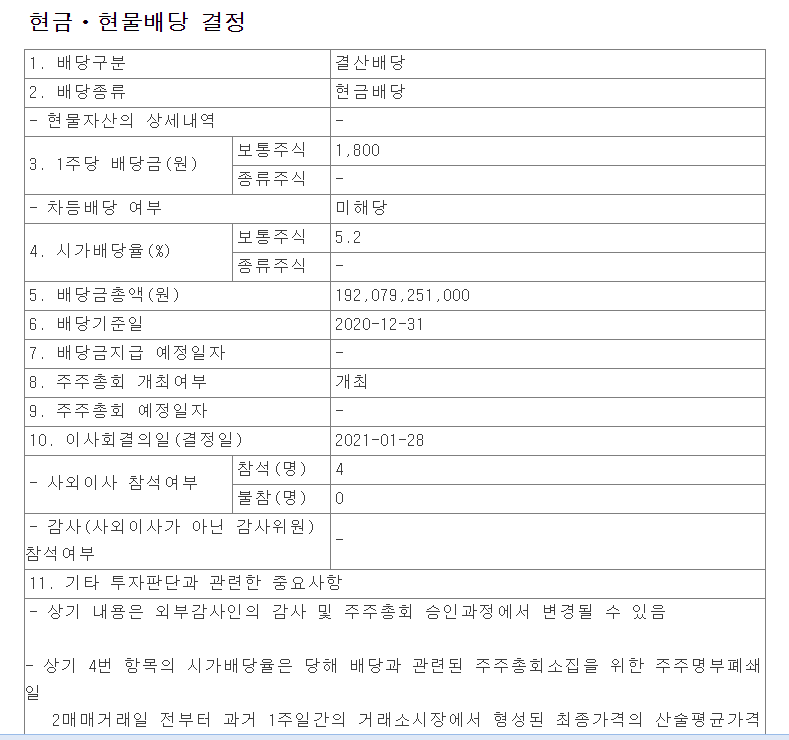 보통주는 1,800원이 배당되며, 시가배당율은 5.2%입니다. 배당금 총액은 1920억원 규모입니다.