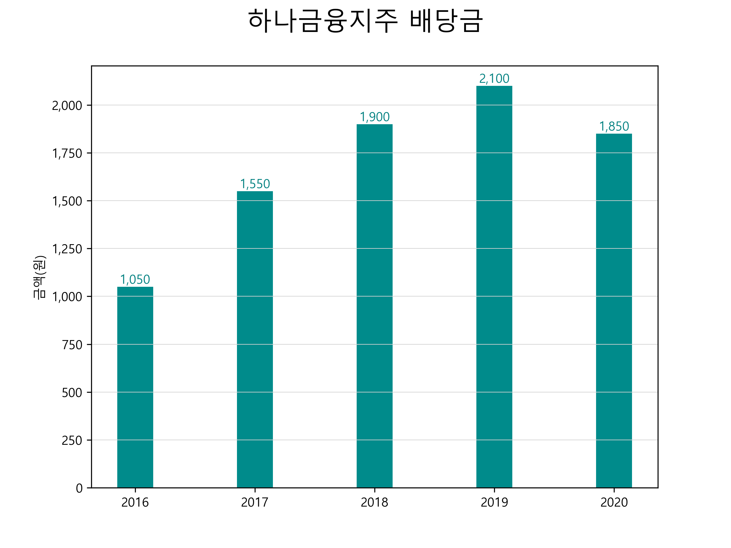 2020년 배당금은 1,850원 입니다. 작년 배당금인 2,100원보다 -11.9% 감소했습니다. 하나금융지주 이사회는 코로나19 사태 장기화로 인한 경기 침체 및 시장 불확실성, 금융당국의 배당성향 권고안 등을 복합적으로 고려해 주당배당금 1350원(중간배당금 포함 1850원, 배당성향 20%)로 결의했습니다.