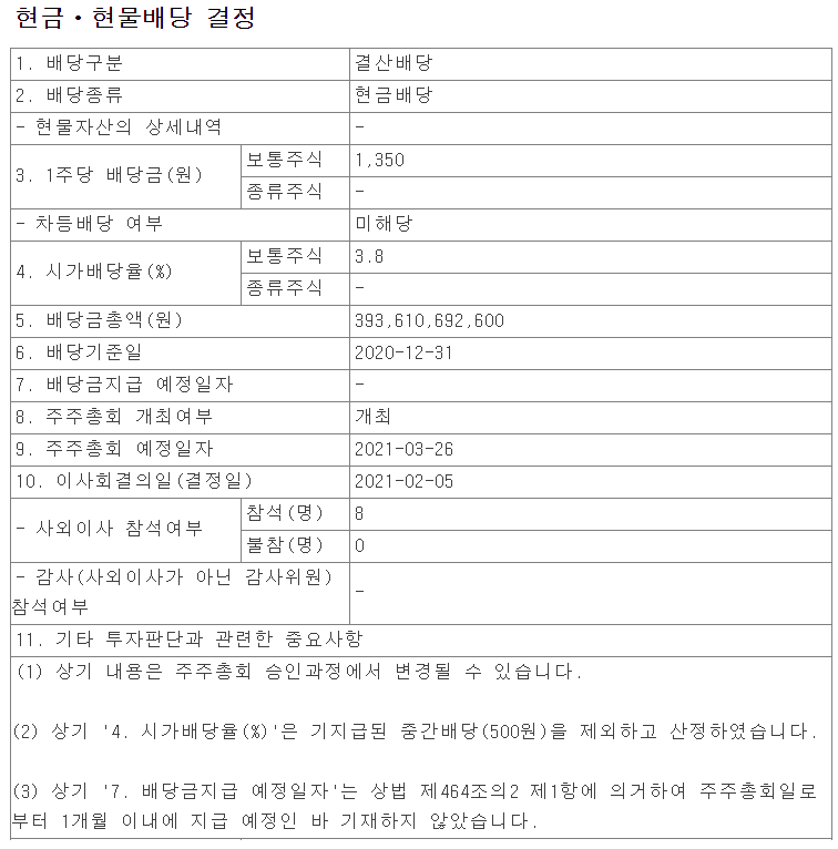 보통주는 1,850원이 배당되는데, 중간배당으로 500원을 기지급하여서 결산배당은 1,350원이 지급됩니다. 시가배당율은 3.8% 이며, 배당금 총액은 3936억원 규모입니다.