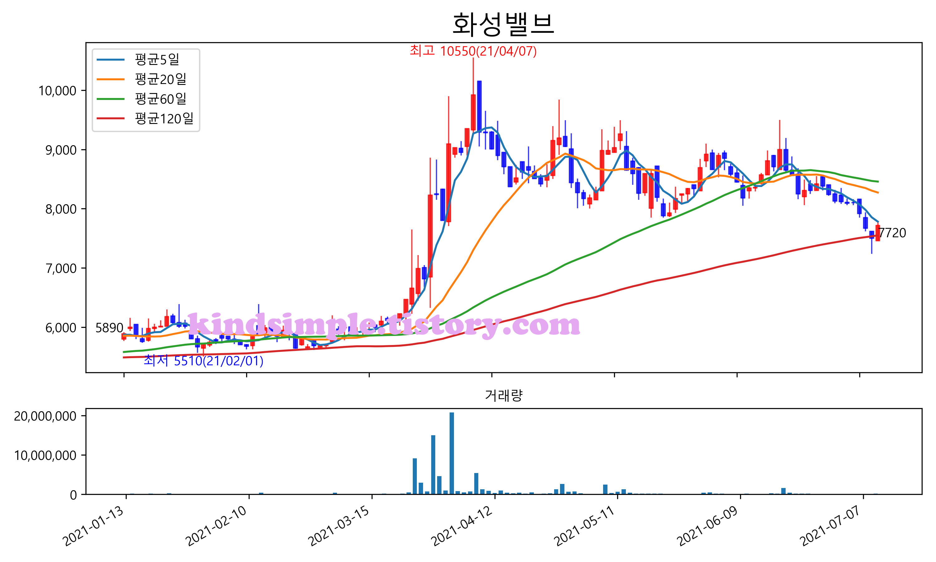 최근 6개월간 캔들차트 및 이동평균선입니다.