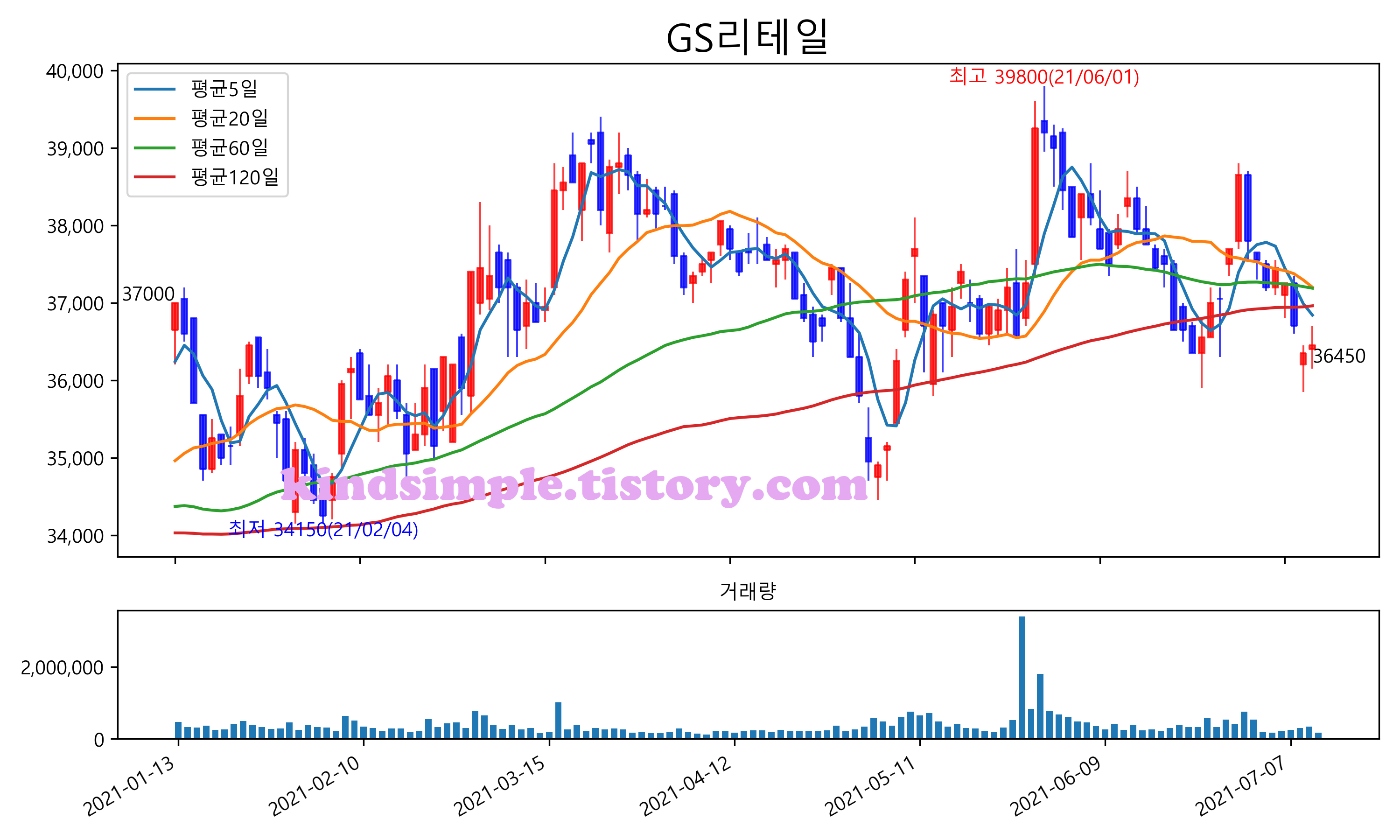 최근 6개월간 캔들차트 및 이동평균선입니다.