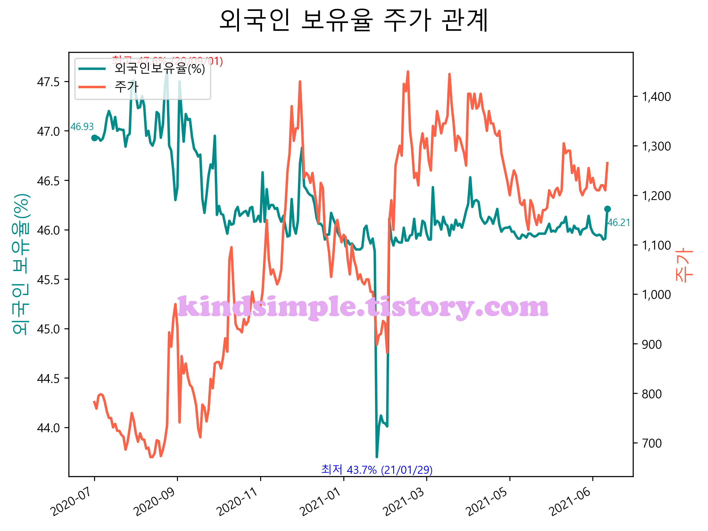최근 1년간 외국인 보유율 및 주가와의 관계입니다.