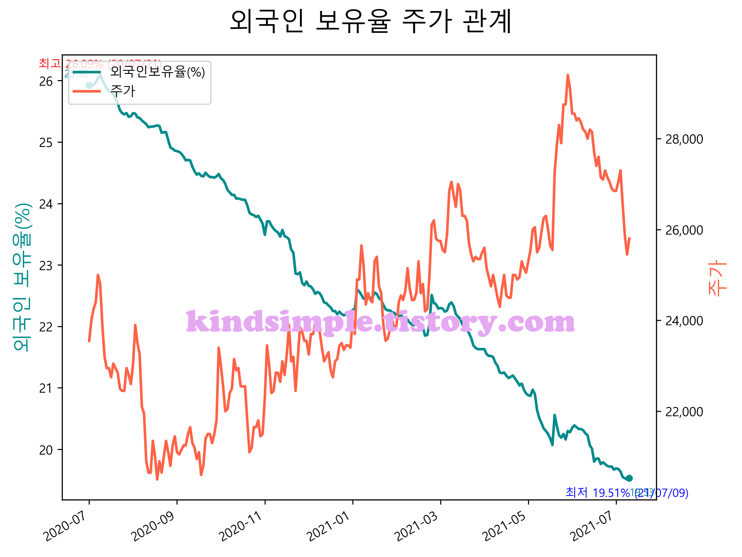 최근 1년간 외국인 보유율 및 주가와의 관계입니다.