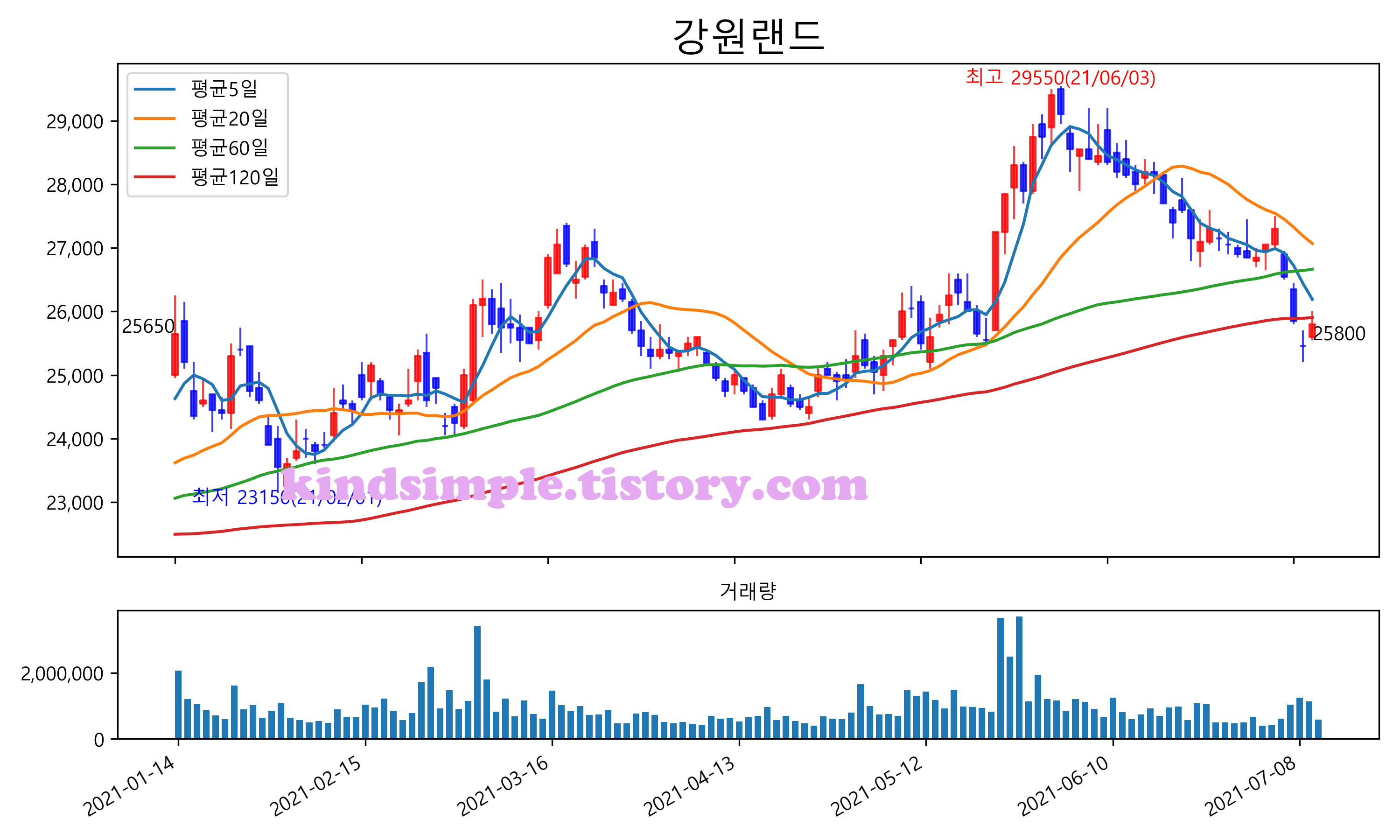 최근 6개월간 캔들차트 및 이동평균선입니다.